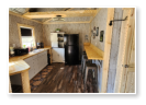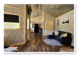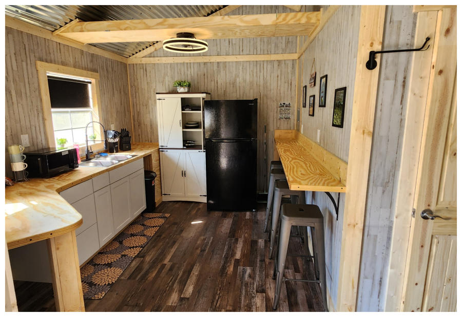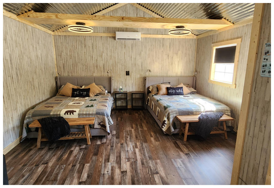 LiL Tackett Cabin (Sleeps 2-4)  •	Queen Bed & Queen Pull Out Couch  •	Bathroom With Full Shower and Linens •	TV •	Kitchen  •	Air Fryer •	Griddle •	Toaster •	Coffee Maker •	Microwave •	Refrigerator •	All Utensils